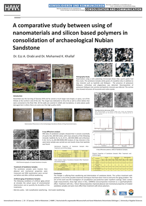 Nubian Sandstone at Gebel el-Silsila was used in building huge ancient Egyptian temples in Upper Egypt, such as Dendara, Karnak, Loxour, Esna, Edfo, Kom Ombo and Philae Temple. Some rock chapels were also carved into the mountain, such as the rock chapel of Horemheb XVIII Dynasty. All the rock chapel walls are covered in reliefs and inscriptions, in some places quite damaged, but in others there are some very fine high-quality reliefs. Some sandstone samples were taken to be examined and analyzed using an optical polarizing microscope (OPM), scanning electron microscope (SEM) and X-ray diffraction (XRD). The sandstone samples were treated. Their physical and mechanical properties were measured before and after artificial weathering. The following conditions of artificial aging aimed at simulating the actual cause of environmental deterioration and at quantifying the durability of the treatments. The research ended with some important conclusions, as the chapel is suffering from weathering and deterioration of its sandstone blocks. The surface treatment with polymers is one of the possible treatment techniques that have been tried to overcome the aging problem. Static contact angle measurements show high values in SiO2/ [MMOS] nano composites treatment as a super hydrophobic effect and treatment with SiO2 /silicon nano composites improved physical and mechanical properties of treated sandstone samples and were more effective than treatment with silicon polymers.