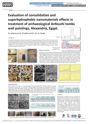 Al-Anfoushi Monumental Tombs date from the first half of the 3rd century BC (about 250 BC), including the ends of the Ptolemaic age and the beginnings of the Roman age: these limestone tombs contain wall paintings. Samples from wall painting including limestone and mortar have been examined and analyzed. Examination using a polarizing microscope shows that the stone support of mural paintings is Oolitic limestone; it contains calcite, quartz, iron oxides and clay minerals. Examination using SEM shows the disintegration of crystals by salts crystallization. XRD patterns of the stone shows a calcite mineral, in addition to quartz and halite. The mortar consists of calcite, card No. (5-0586), quartz and halite. Mortar samples (sand: lime, 3:2 parts by weight in order) were prepared in dimensions of 5x5x5 cm as cubes. Samples were treated using Ca(OH)2/TEOS nanocomposites, Ca(OH)2/ poly methyl methacrylate, SiO2/TEOS nanocomposites, SiO2/poly methyl methacrylate nanocomposites, SiO2/ methyl hydroxy siloxane nanocomposites and SiO2/wacker 290 (silane/Siloxane) nanocomposites, then physical, static contact angle and mechanical properties were measured, then SEM examination was carried out. Wall paintings in the Anfoushi tombs all suffer from weathering and deterioration due to different factors, for example, sources of moisture and salts crystallization. Treatment and consolidation using Ca(OH)2/polymer nanocomposites and SiO2/polymer nanocomposites lead to the improvement of the characteristics of the polymers and mortars. Contact angle measurements show that SiO2/water-repellent polymers nanocomposites have a superhydrophopic effect for treated mortar samples. Finally, both SiO2 and Ca(OH)2 nanoparticles with silicon polymers as nanocomposites gave high proficiency in the consolidation and isolation of treated mortar samples.