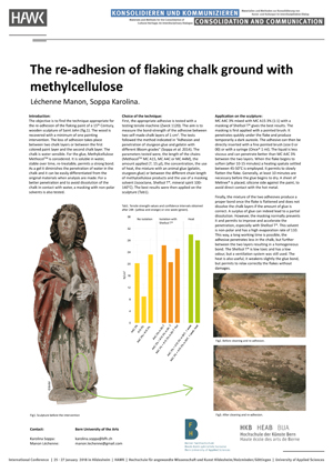 This poster presents the study to find the appropriate adhesive for the re-adhesion of flaking paint on a 15th century wooden polychrome sculpture. Methylcellulose A4C and mixtures with methylcellulose A15 were investigated, with and without pre-wetting using ethanol, isooctane and Shellsol T. The benefits of methylcellulose are: durable, soluble in water or in organic solvents and the viscosity is adaptable. Tensile strength was measured with a tensile testing machine (Zwick 1120), as described in the “adhesion and penetration of sturgeon glue and gelatine with different Bloom grades” (Soppa et al. 2014). The adhesives selected were applied between two chalk layers (test flakes). The results revealed that pure methylcellulose Methocel® A4C (middle sized chains) with a Shellsol T prewetting can hold the paint flakes together particularly well with a low concentration of 3%. If mixed (1:1) with Methocel® A15 (short sized chains), it lowers the viscosity to permit a better penetration between the paint layers. An additional prewetting with Shellsol T and the use of a heat spatula resulted in a very satisfactory bond.
