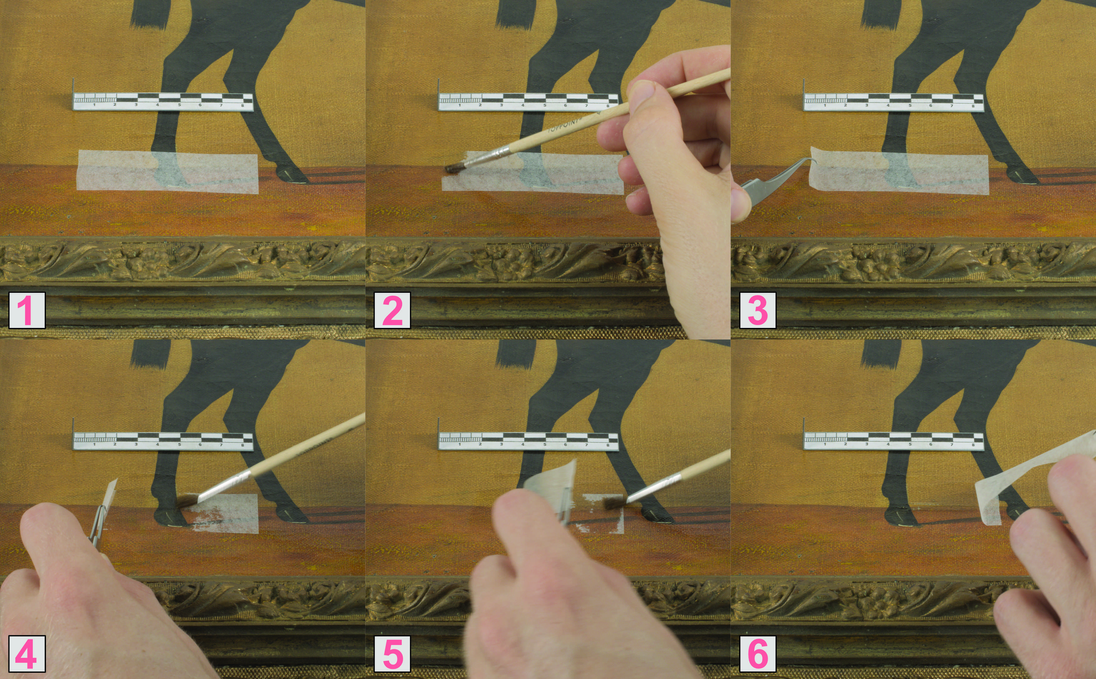| Zusammenfassung: | This master´s thesis investigates the development of reversible, self-adhesive facings for the conservation of mounted wooden objects and paintings. Conventional methods, in which water-soluble adhesives are activated by moisture, harbour risks due to moisture and drying stresses during application. As an alternative, a coating based on the acrylic dispersion Lascaux® 303 HV is being tested, whose low glass transition point (-35 °C) enables pressure-sensitive adhesion without this moisture input. The aim was to develop a coating that can be removed with water or aliphatic hydrocarbons without leaving any residue. Peel tests were used to compare coatings with additives such as MethocelTM A4M, Aquazol®, 500, Lascaux® 498 HV and Evacon-RTM in order to control adhesion and reversibility. Solvent penetration was influenced by selectively disrupting film formation (foaming, dilution). While water-based removals were only possible to a limited extent, two mixtures with aliphatic hydrocarbons enabled adhesion-free removal of glass, emulsion paint and a painting dummy. The decisive factors here were a broken film structure and adapted adhesion. This work shows that self-adhesive facings could be a promising alternative, but that further research is needed into long-term stability, hygroscopic effects and residues. Adhesion changes in particular should be considered beforehand. The results thus could provide a basis for the further development of stress reduced facings in restoration practice. |